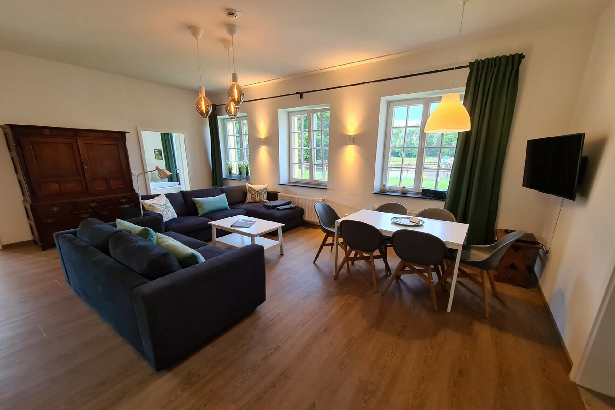 In das herrschaftliche Gutshaus haben die Gastgeber exklusive Ferienwohnungen eingebaut. An Herbst- und Wintertagen spendet der alte Kamin in der Diele des Wohnhauses Wärme und Gemütlichkeit und lädt zu Gesprächen mit anderen Gästen ein. Auf der weitläufigen Gartenanlage finden sich gemütliche Sitzecken zum Entspannen und zum Träumen mit Blick auf den Gartensee. Wenn das Wetter mal nicht so schön ist, toben sich die Kinder auf dem riesigen Spieleboden aus mit der Tischtennisplatte, dem Badmintonnetz, dem Trampolin. Die Großen ziehen sich in die warme Diele des Wohnhauses zurück.